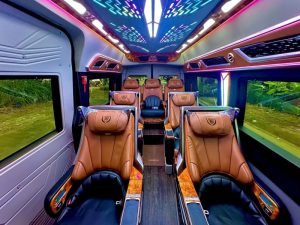 Với thiết kế nội thất cao cấp, xe limousine 9 chỗ nổi bật bởi hàng ghế bọc da êm ái, có thể ngả sâu thư giãn, cùng hệ thống đèn trần LED, màn hình giải trí, cổng sạc, tủ lạnh mini và nhiều tiện ích khác. Mỗi hành khách đều có không gian riêng, tách biệt và thoải mái như đang ngồi trên một khoang hạng thương gia. Đây là lý do vì sao loại xe này được rất nhiều khách VIP, doanh nhân và gia đình lựa chọn khi di chuyển dài ngày hoặc đi các tỉnh xa như Huế, Hội An, Bà Nà, Quảng Bình, hoặc đơn giản là đón tiễn sân bay.